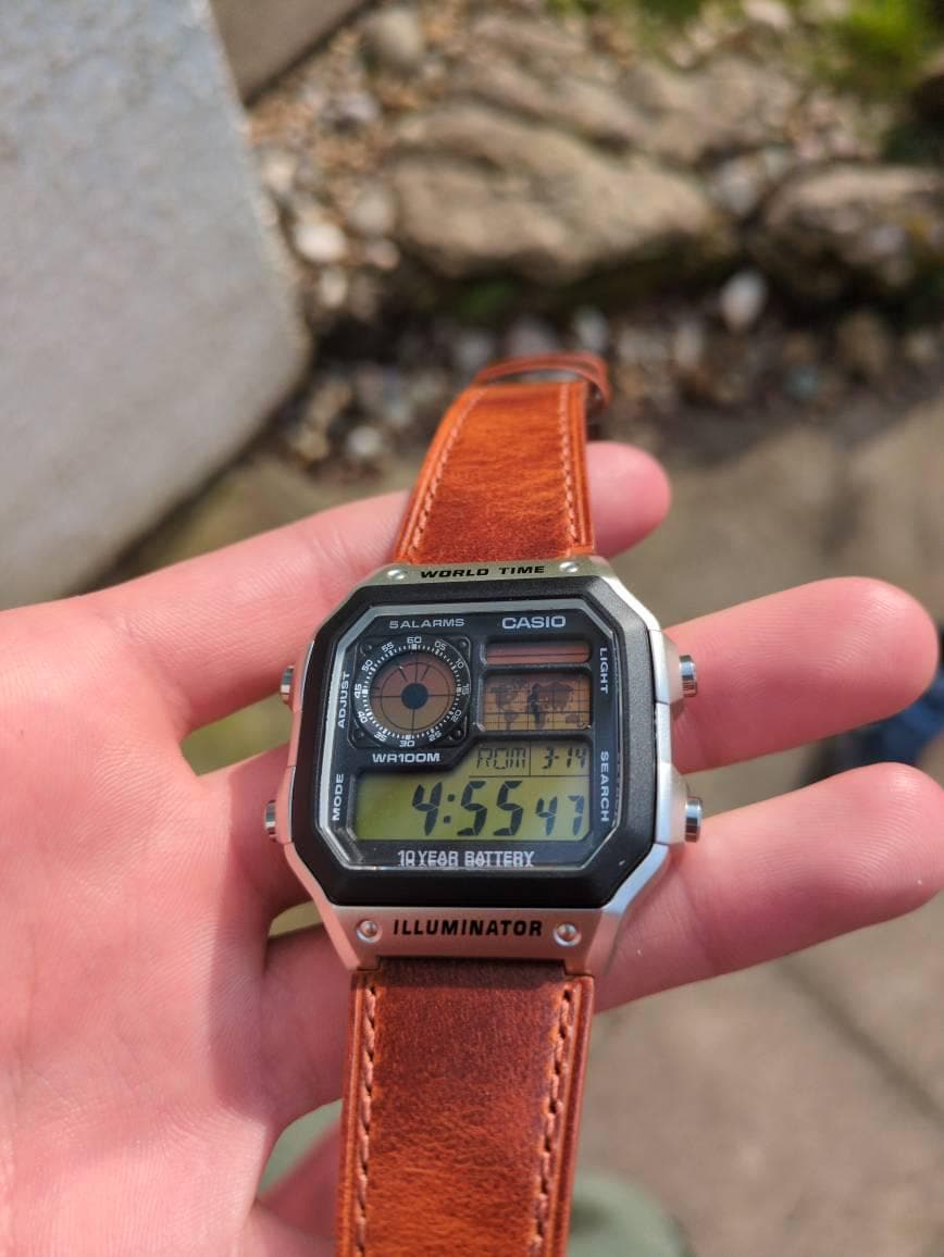 Casio AE-1200 Royale Illuminator Watch with Sunset Orange/Yellow Colour Mod and Custom Brown Leather Strap. Brand new with original box and papers. Each item is hand-modified and unique. Great for birthdays and Christmas gifts.