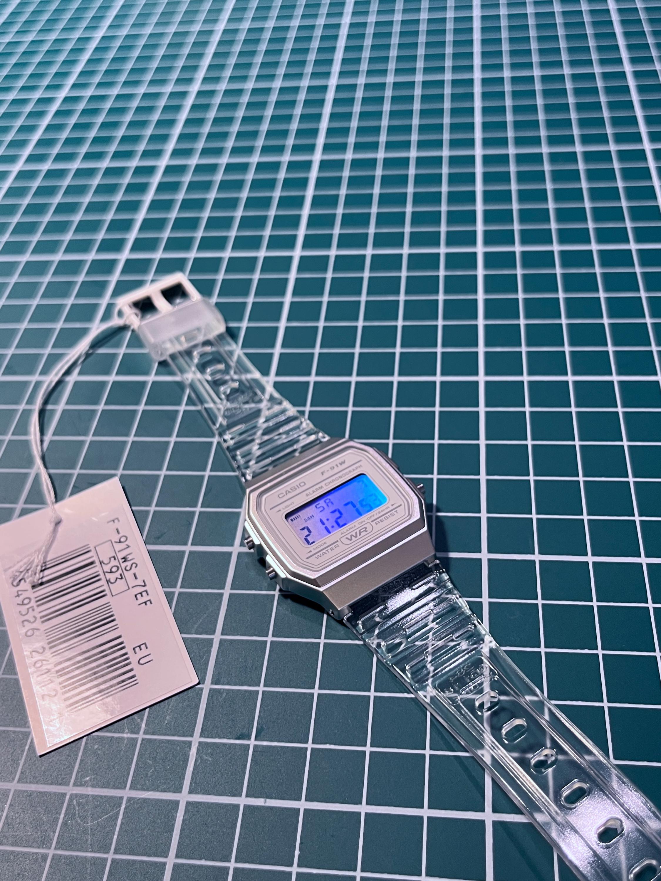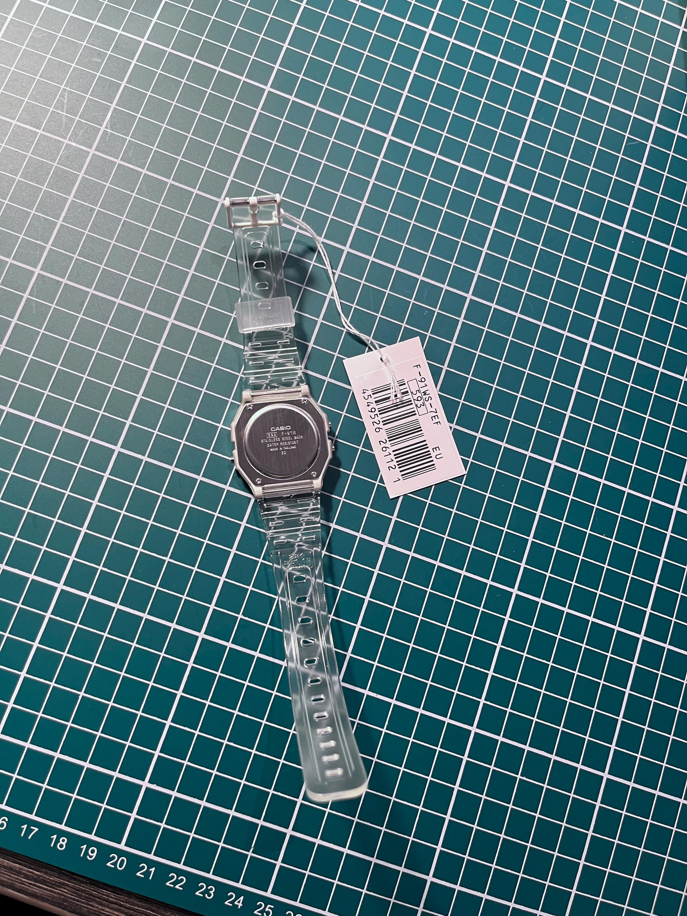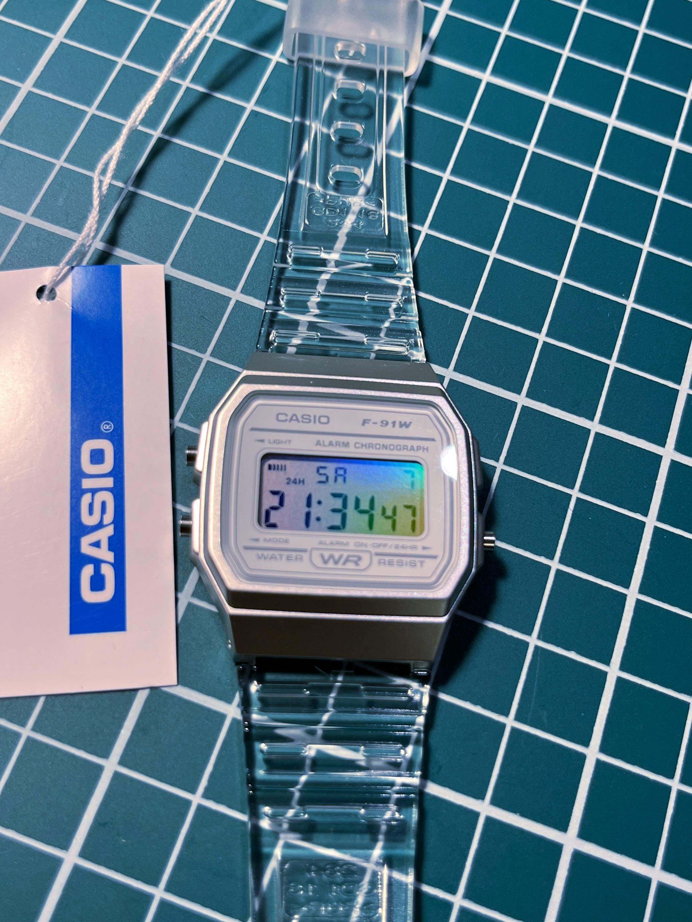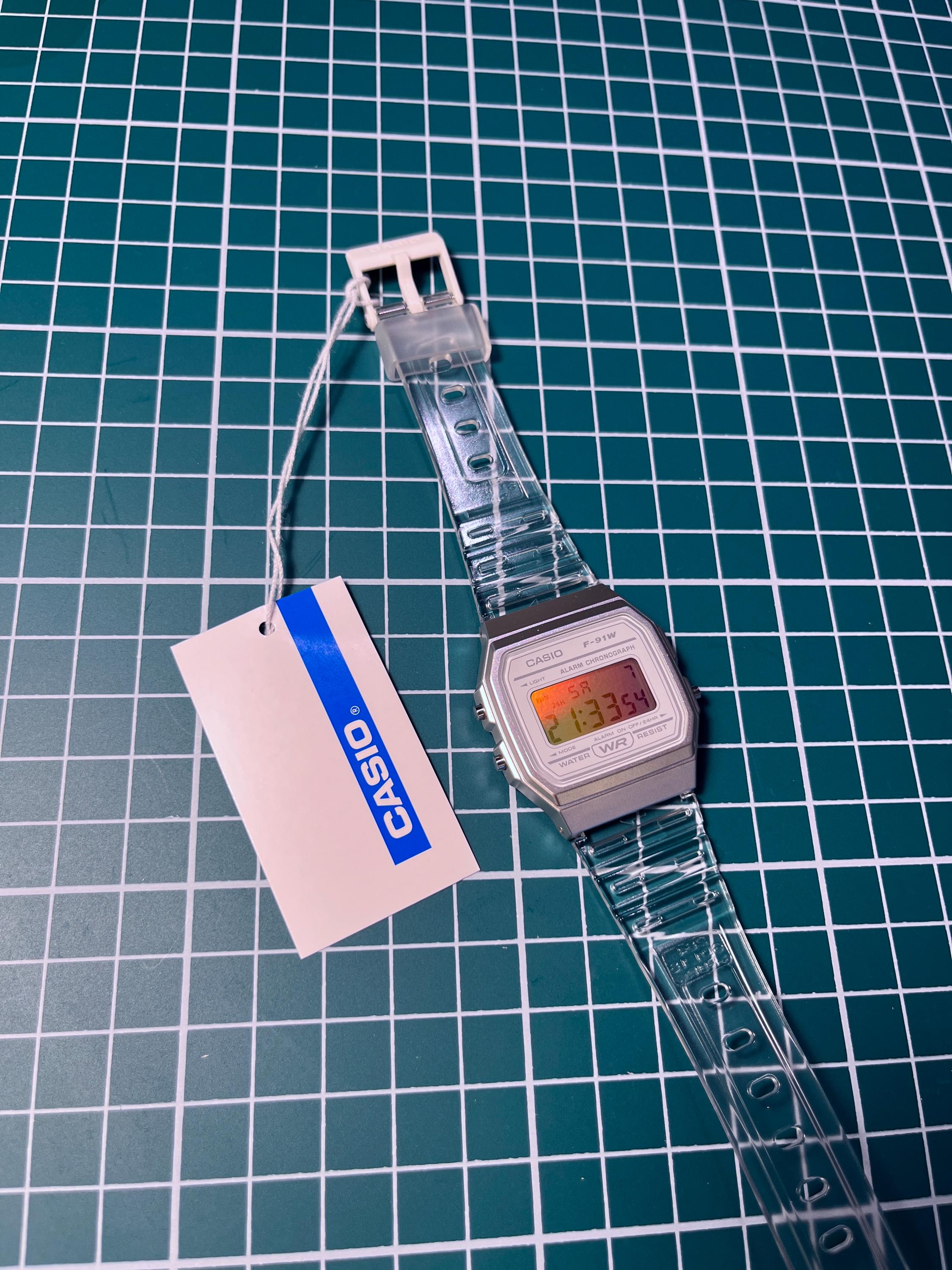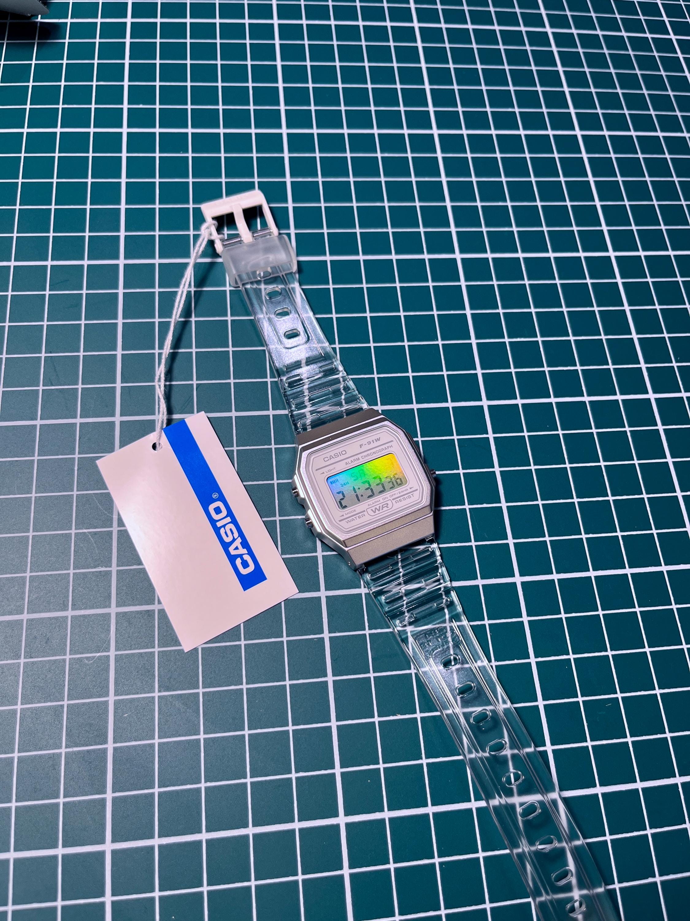 Iridescent Modified Watch Based on Casio F-91W – Custom Digital Watch with Holographic Screen. Original transparent rubber strap. International shipping available. Multicolour pearlescent face. The iridescent rainbow look works via reflection and is dependent upon the light source. The effect is at its most visible around sunlight or bright lights and is less visible in low light.