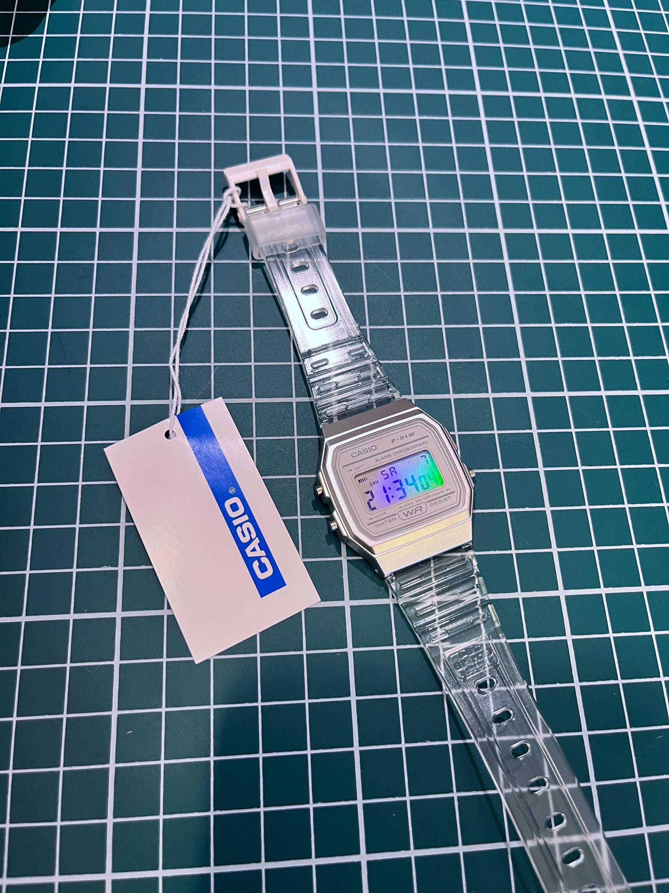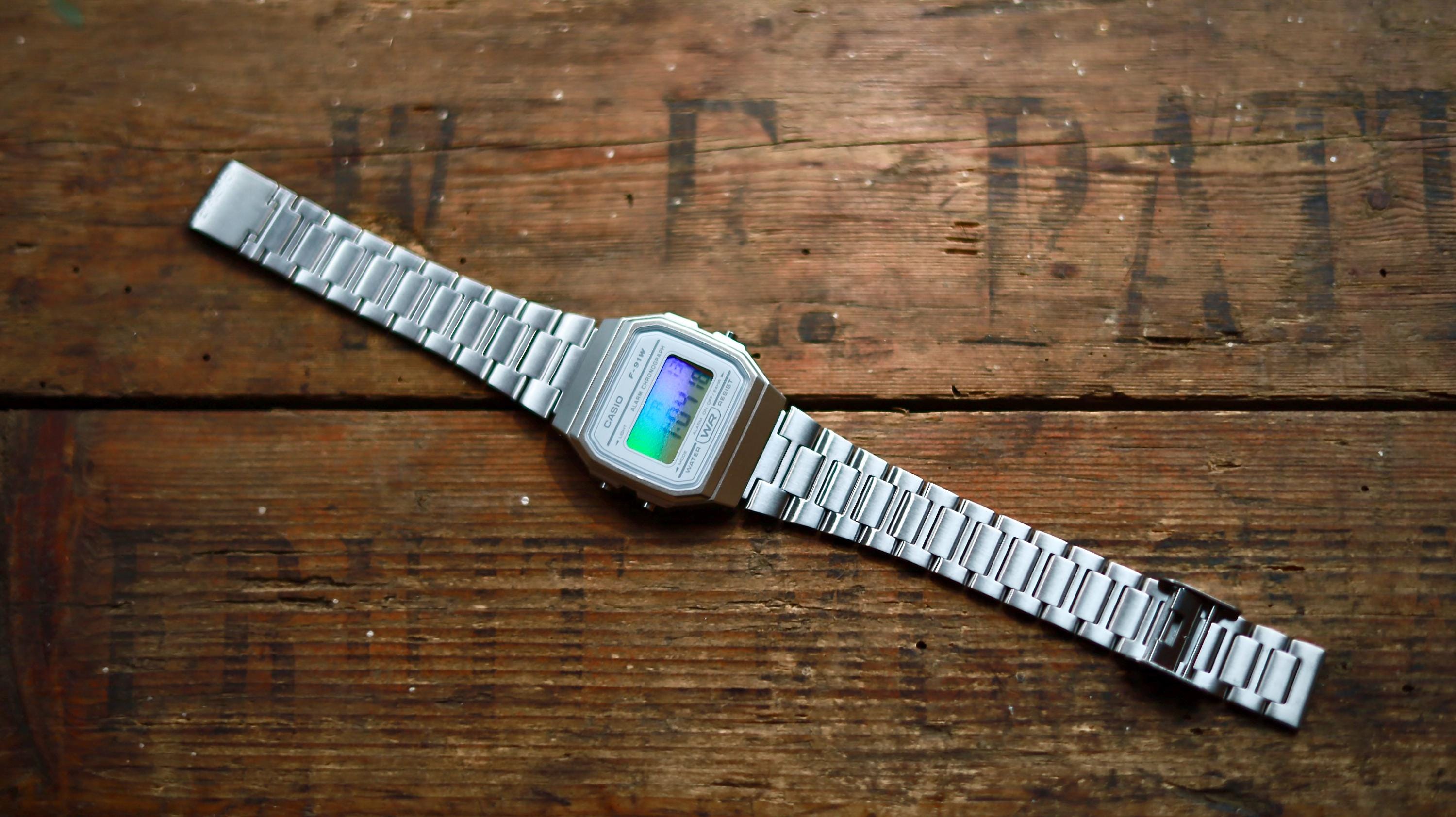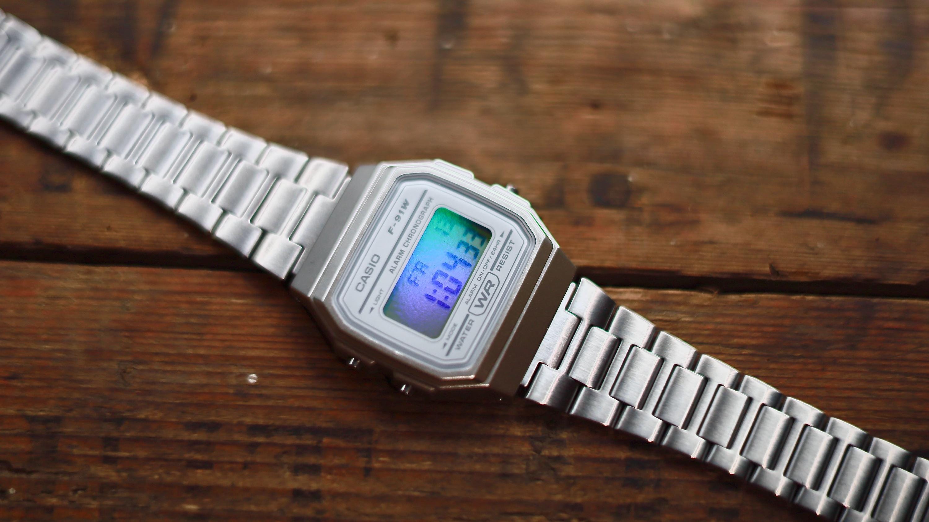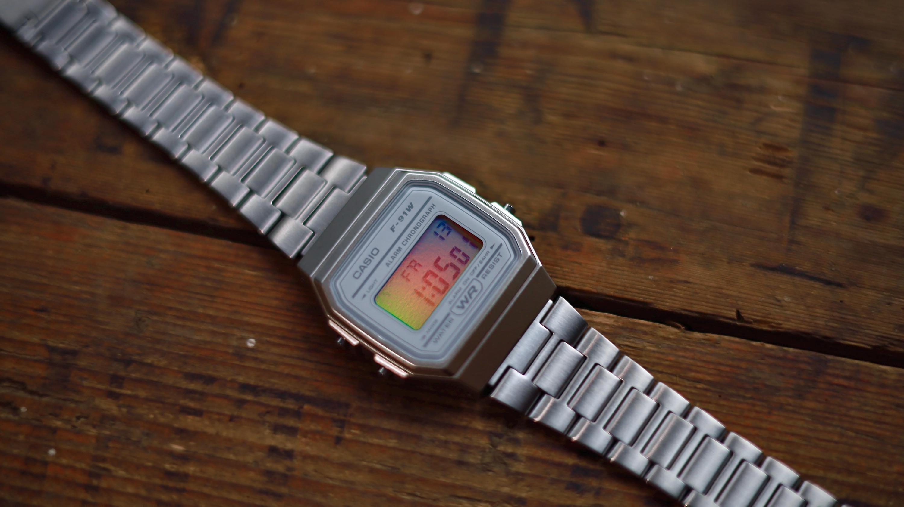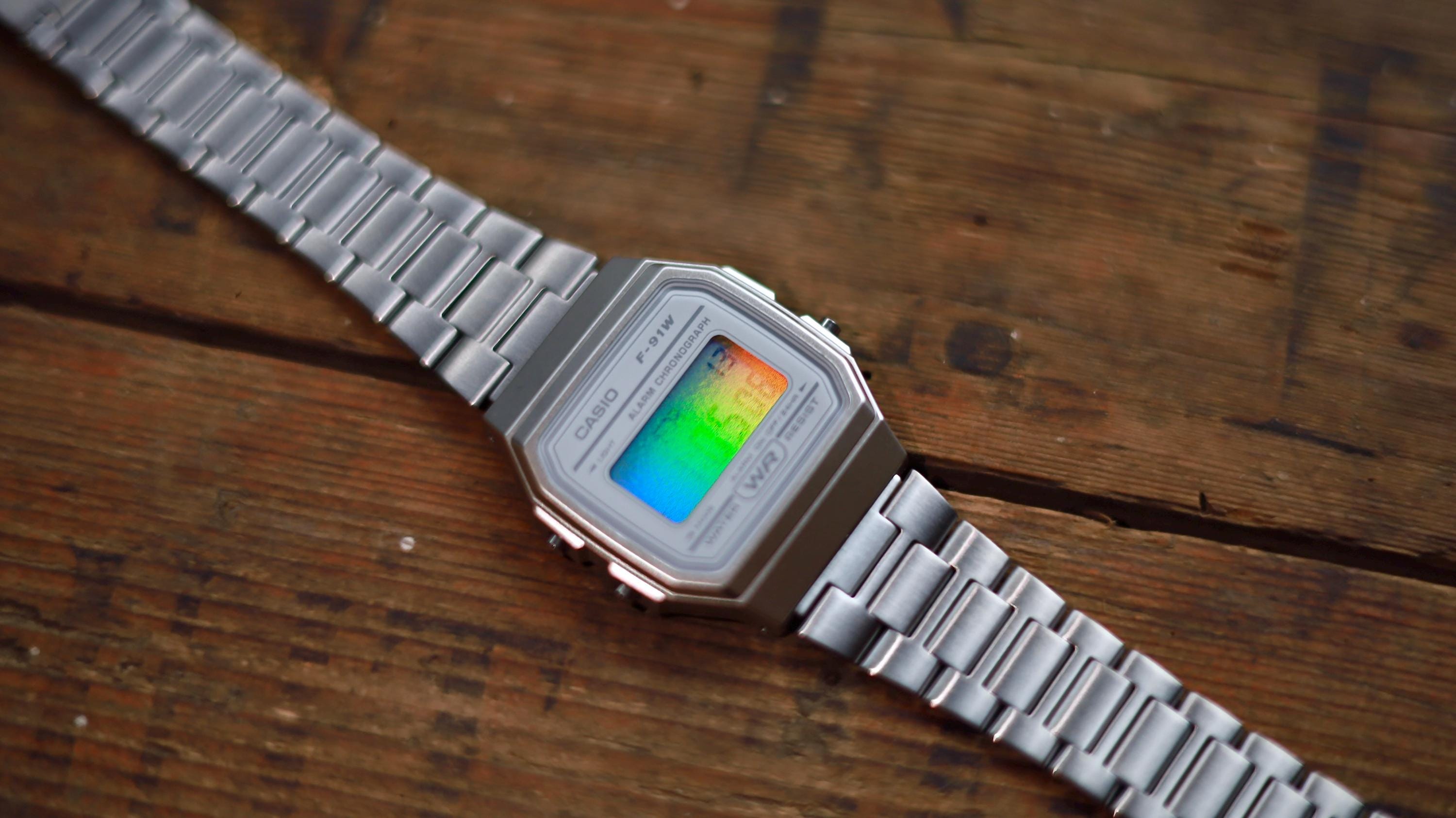Iridescent Modified Watch Based on Casio F-91W – Custom Digital Watch with Holographic Display. Comes with original box and papers. Has a stainless steel strap (bracelet/band) from a Casio A158/A168 in place of the usual clear rubber one. International shipping available. Multicolour pearlescent face. The iridescent rainbow look works via reflection and is dependent upon the light source. The effect is at its most visible around sunlight or bright lights and is less visible in low light.